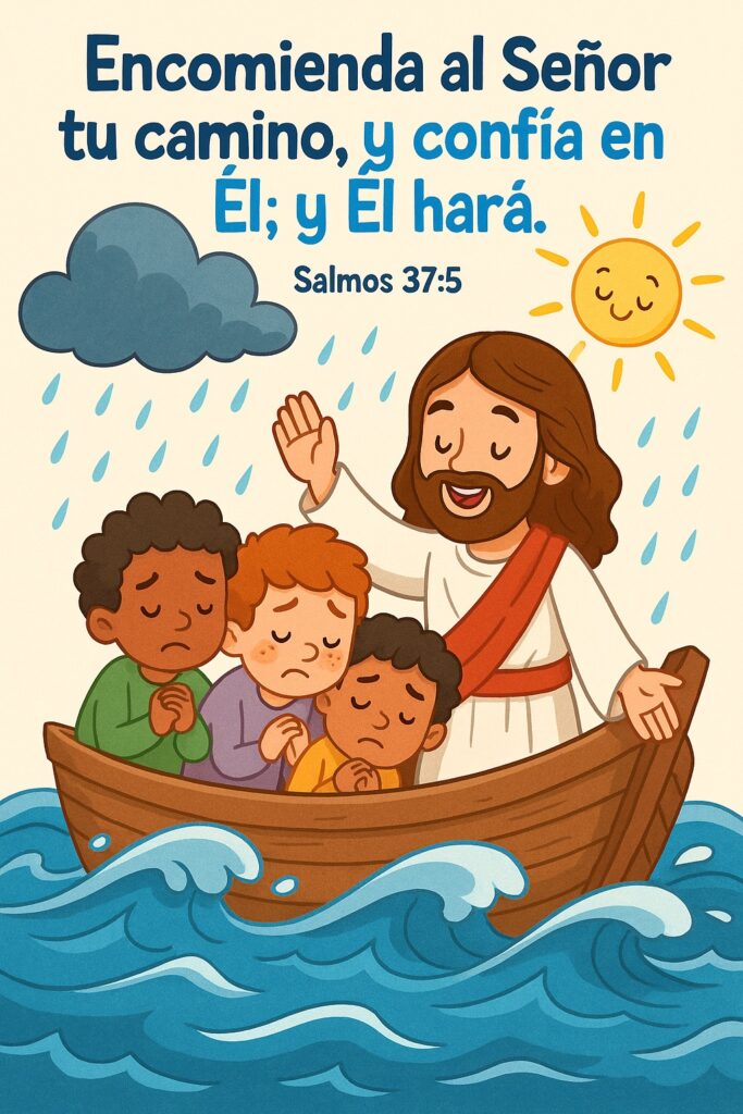 Una noche, los discípulos estaban en una barca cuando comenzó una gran tormenta. El viento soplaba fuerte, las olas golpeaban la embarcación y todos estaban asustados. Pero Jesús dormía tranquilo. ¿Por qué? Porque Él sabía que nada estaba fuera del control de Dios. 🌤️
