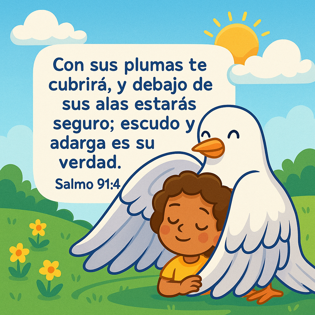 A veces, cuando tenemos miedo o algo nos preocupa, lo único que queremos es un abrazo que nos haga sentir seguros. ¿Sabías que Dios también tiene “alas” para protegernos? No son alas como las de un ave, sino su presencia que nos cubre con amor y cuidado. 💛