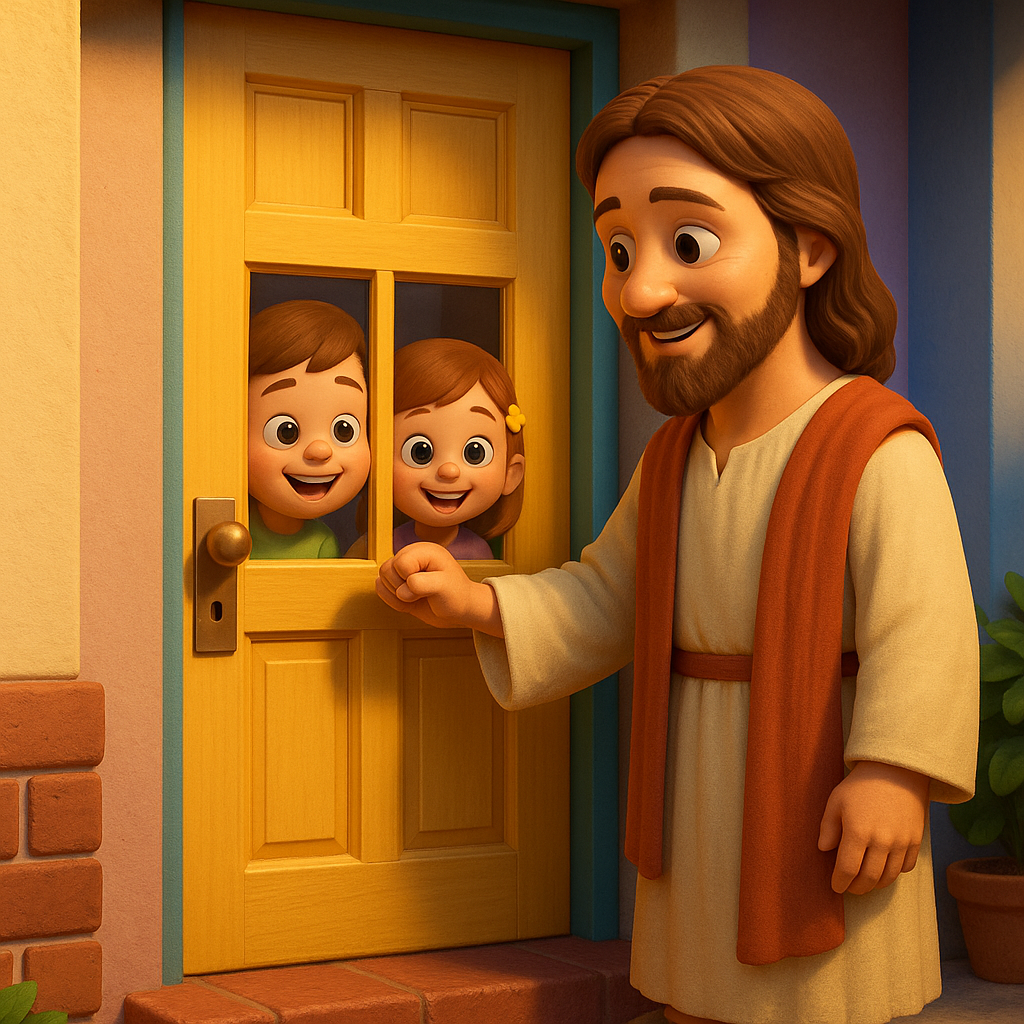 Jesús dijo que Él está a la puerta y llama. ¿Sabes cuál puerta? 💭 ¡La de tu corazón! Él no empuja ni grita, solo toca suavemente porque quiere entrar y ser tu amigo. Cuando le hablas, cuando cantas, cuando haces cosas buenas, estás abriendo la puerta para dejarle entrar. 🚪✨